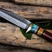 Features As Reviewed: Both knives are made of fine Damascus, are both full-tanged, and both come with a custom leather sheath. Other than shape and size, the difference up front on these two are their handles. One is a stacked leather system, and the other is stag with real turquoise spaces.