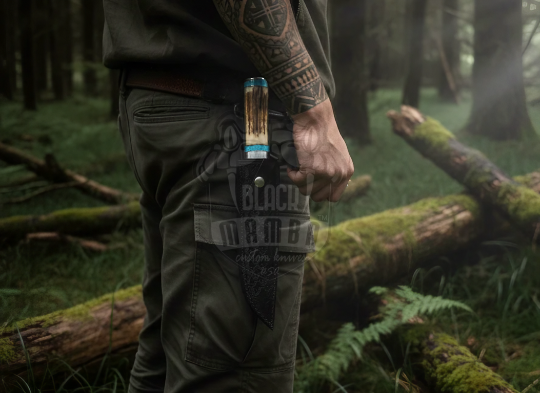 Every knife comes with a hand-stitched genuine leather sheath, designed for secure carry, protection, and immediate access when needed in the field.