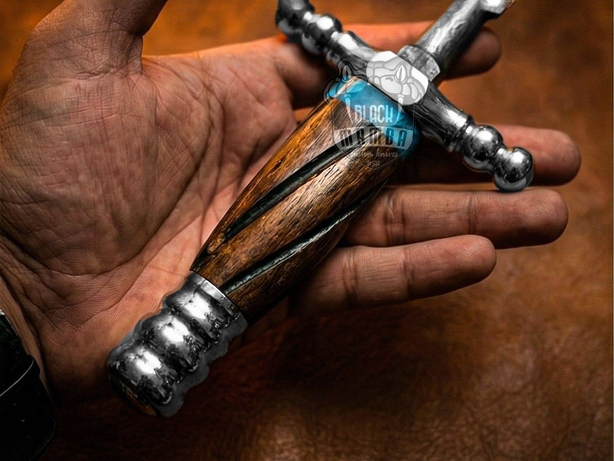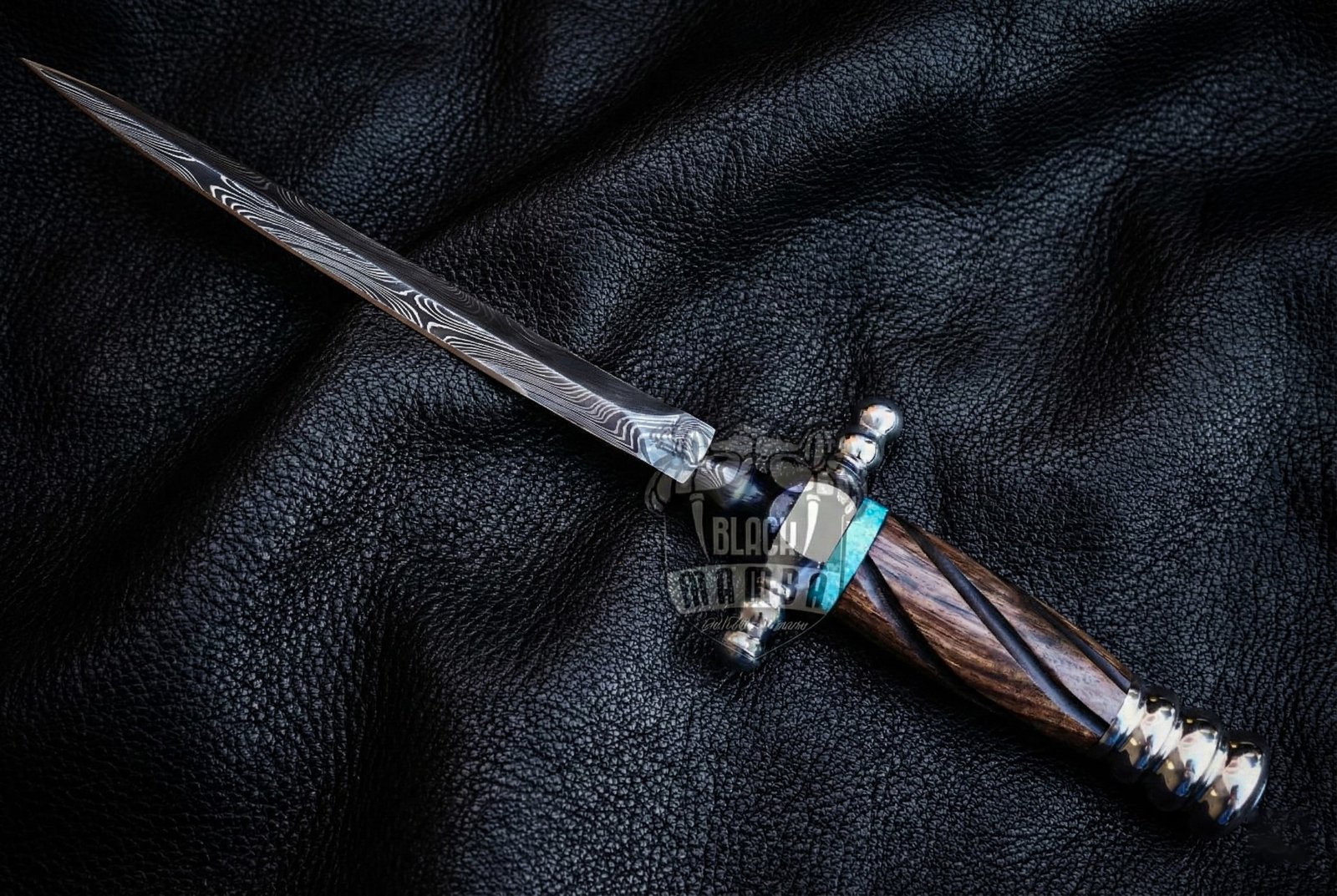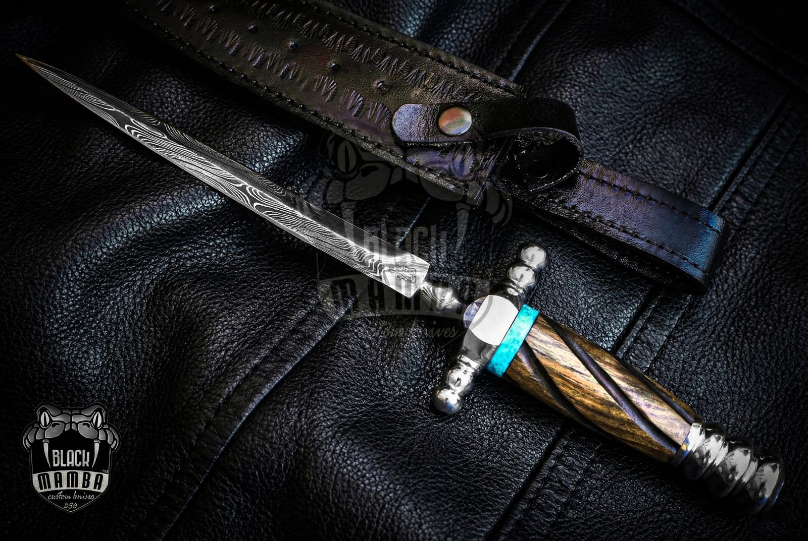 HANDLE MATERIALS: Walnut Burl wood Handle with stainless steel guard and turquoise spacers