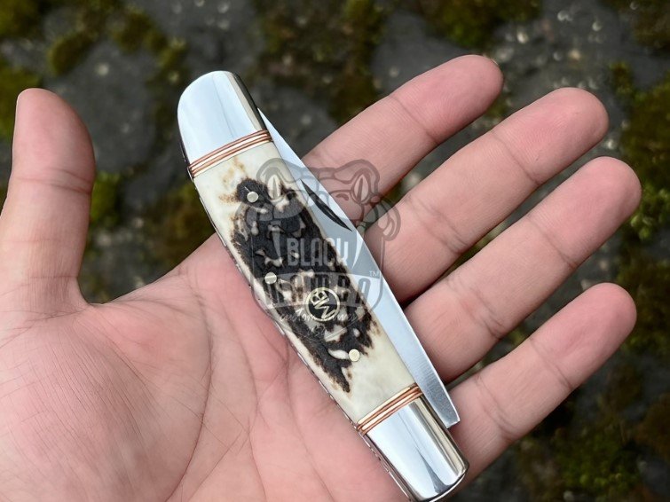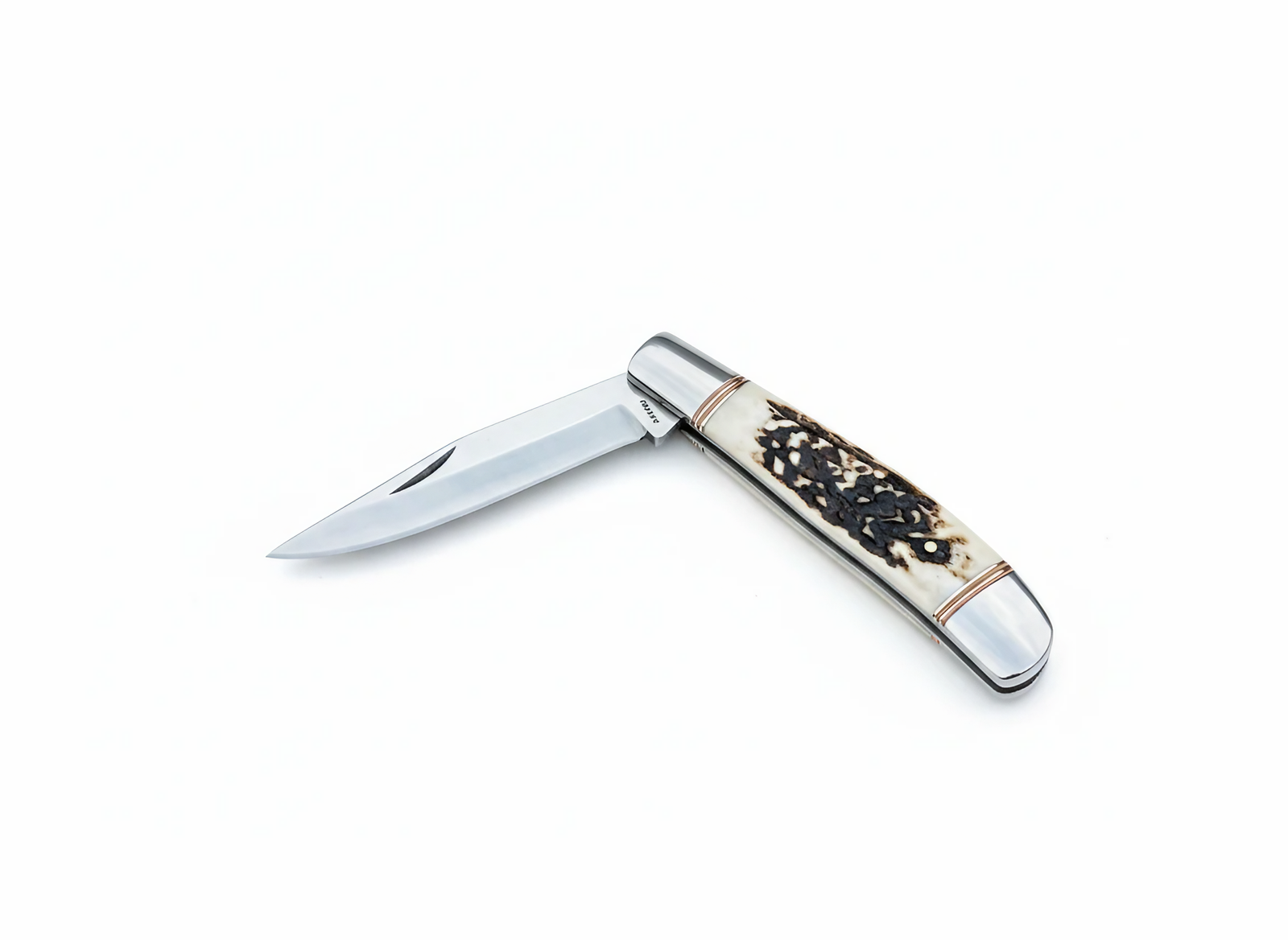 BMK-654 Handmade 440C Steel Pocket Knife with Stage Handle and Leather Sheath | Perfect for Hunting,Camping & Fishing