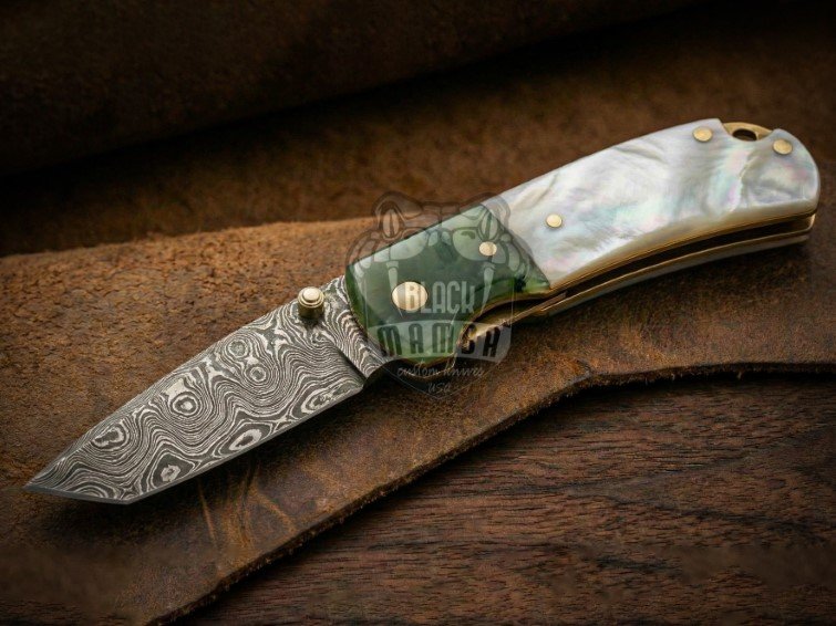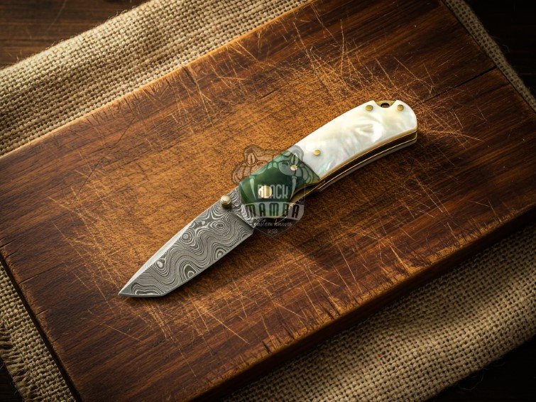 BMK-677 Black Mamba Emerald Pearl Handmade Damascus Pocket Knife With | Sea Shell Handle | Colour Bone Bolster & Leather Sheath Camping ,Hunting , Christmas Gift & Him