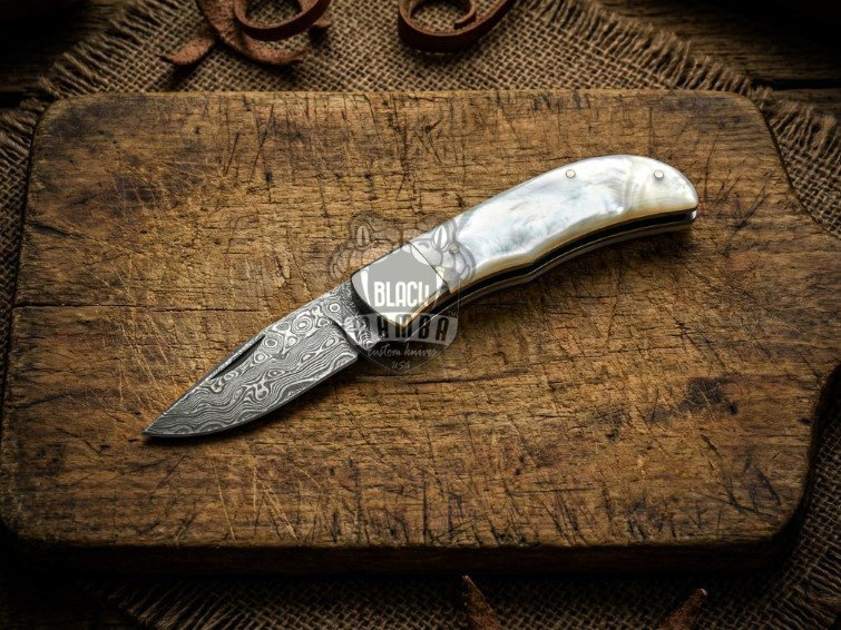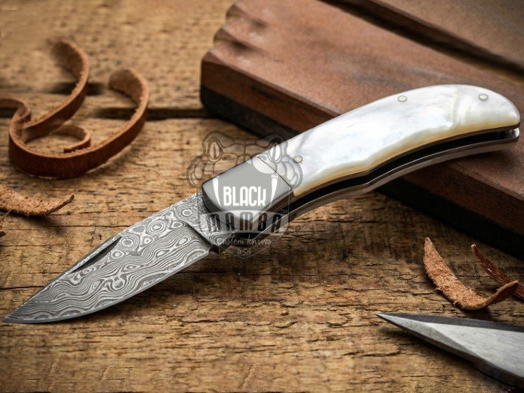 BMK-681 Black Mamba Pearl Serpent Handmade Damascus Pocket Knife | Sea Shell Handle with Steel Bolster | and Leather Sheath Camping ,Hunting , Christmas Gift & Him