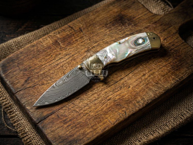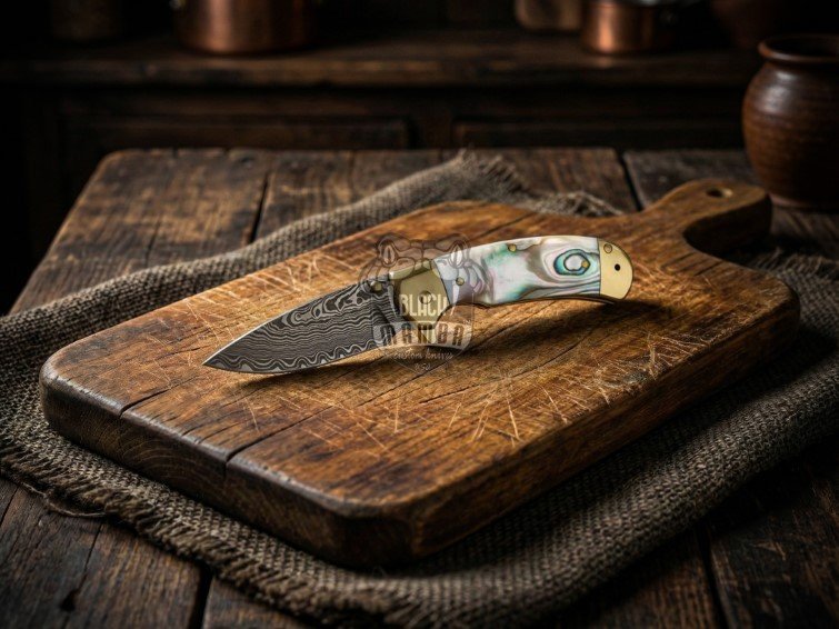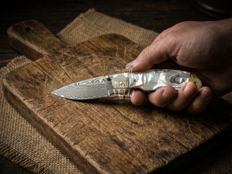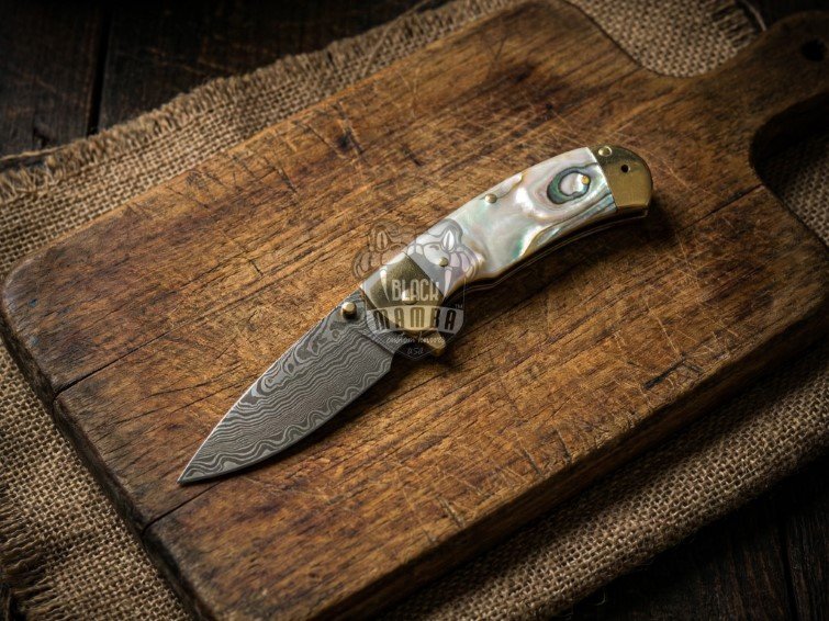 BMK-683 Black Mamba Highland Hunte Handmade Mix Twist Damascus Pocket Knife | Sea Shell Handle | with Brase Bolster and Leather Sheath Camping ,Hunting , Christmas Gift & Him