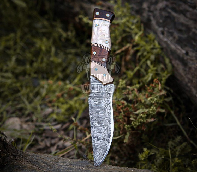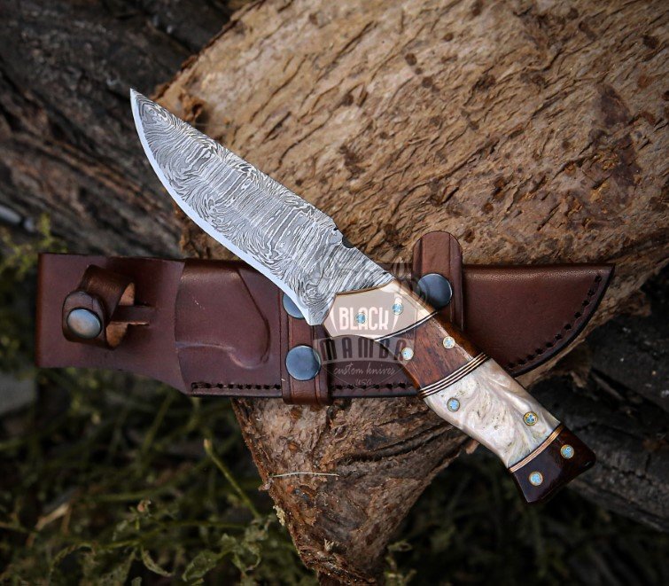 BMK-700 Black Mamba Royal Pearl Handmade Damascus Steel Hunting Knife with| Rose Wood Pearl Shell Handle | and Copper Bolster | and Leather Sheath Custom Gift for Him | Hunting Camping