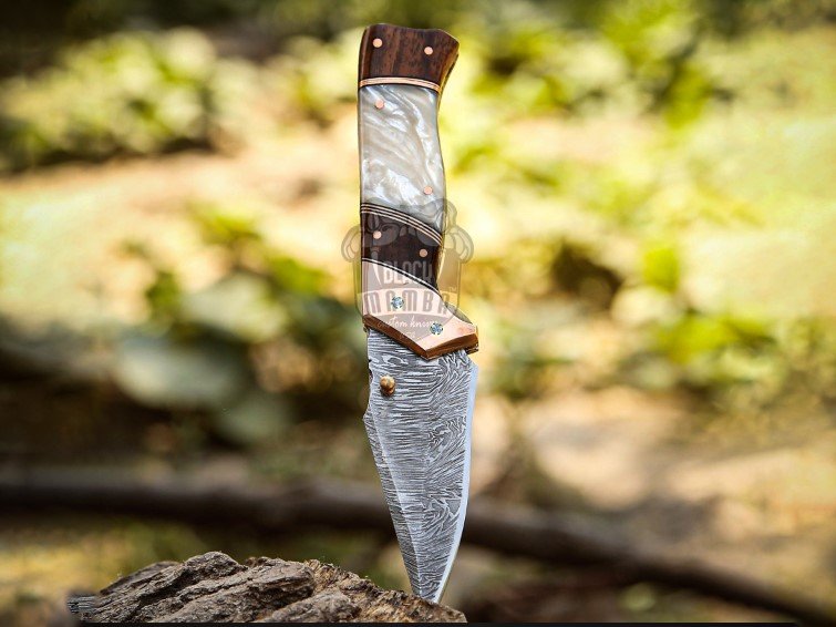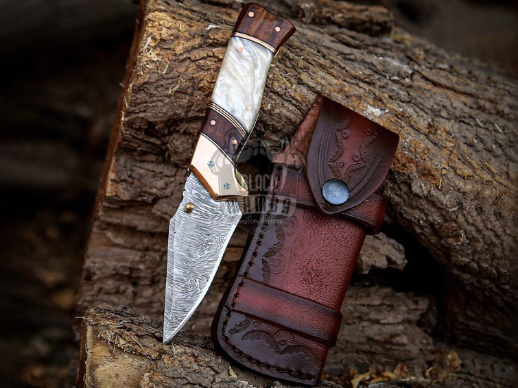 BMK-702 Black Mamba Pearl Legacy Handmade Damascus Steel Pocket Knife | Rose Wood & Pearl Shell Handle | Copper Bolster and Leather Sheath | Custom Hunting Gift for Him & Her