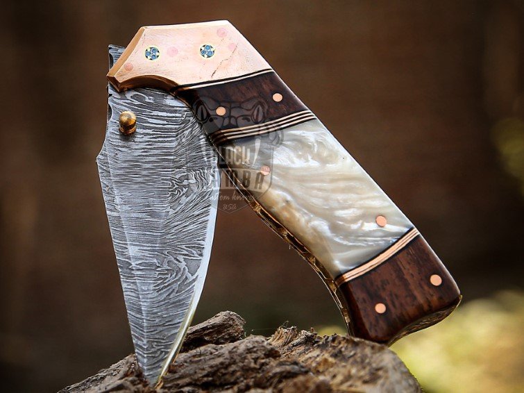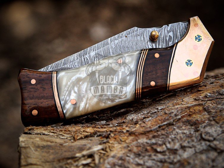 Handmade Damascus steel pocket knife, custom folding knife, rose wood handle knife, pearl shell handle knife, copper bolster knife, hunting pocket knife, EDC folding knife, camping knife, survival knife, leather sheath knife, custom gift for him and her, premium handmade knife, collector pocket knife, Black Mamba Knives.