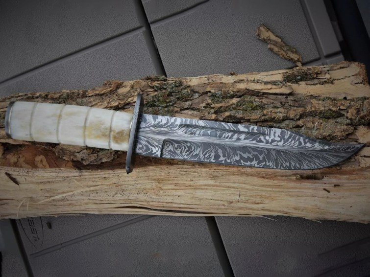 Introducing a bold reinterpretation of the iconic Ka-Bar — reimagined by BLACK MAMBA KNIVES in this limited edition handmade hunting bowie. Crafted with a feather-pattern Damascus blade and a striking camel bone handle, this knife fuses legendary military heritage with artisanal precision.