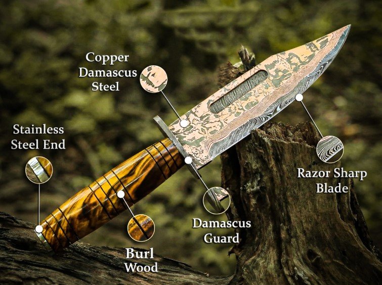 Forged from premium Copper Damascus steel, this hunting knife delivers exceptional edge retention, durability, and corrosion resistance. The rich copper patterning on the blade enhances both strength and visual appeal, while the ergonomic burl wood handle provides a comfortable, secure grip for extended use in the field.