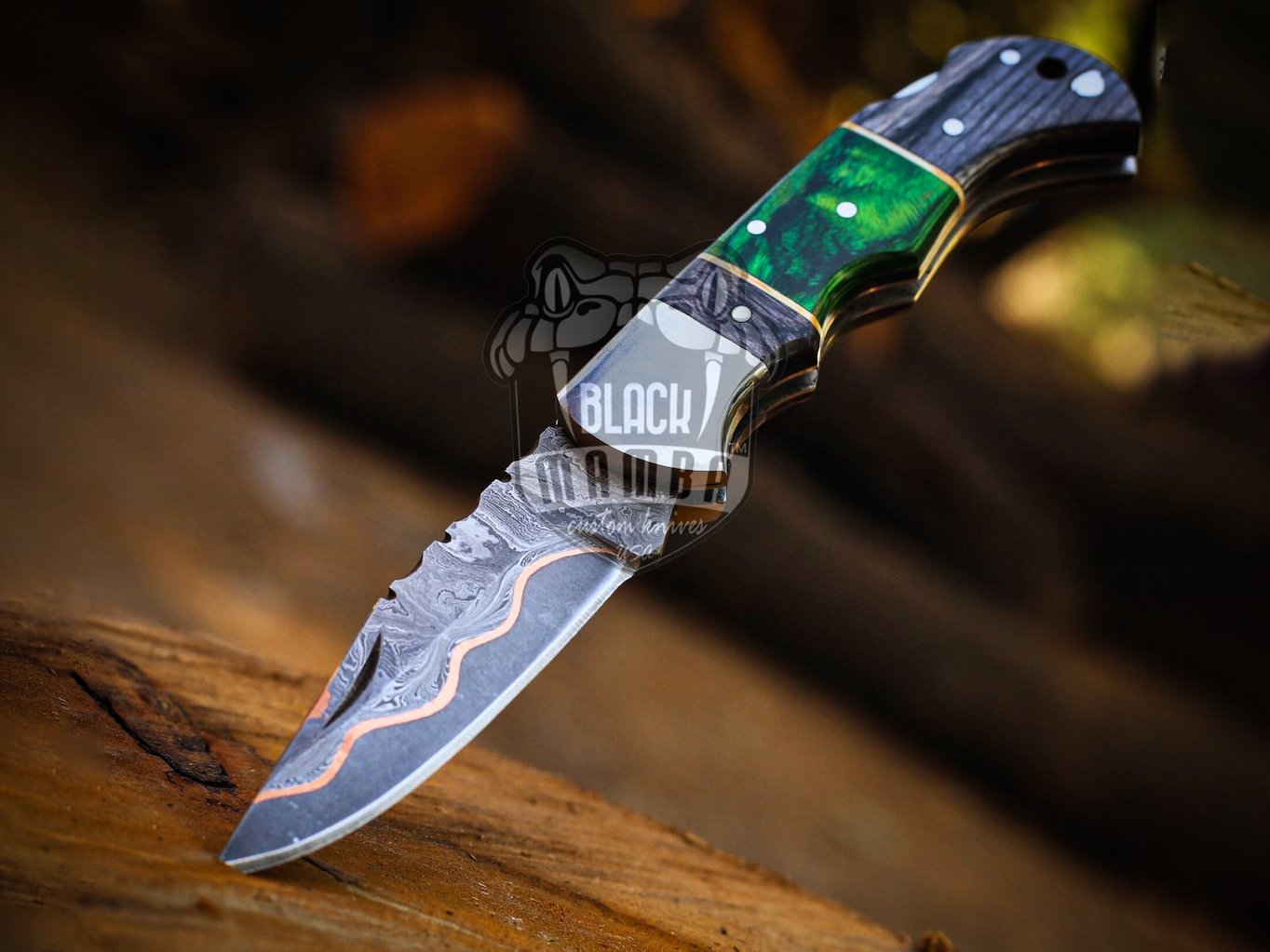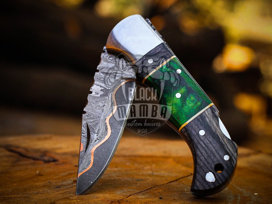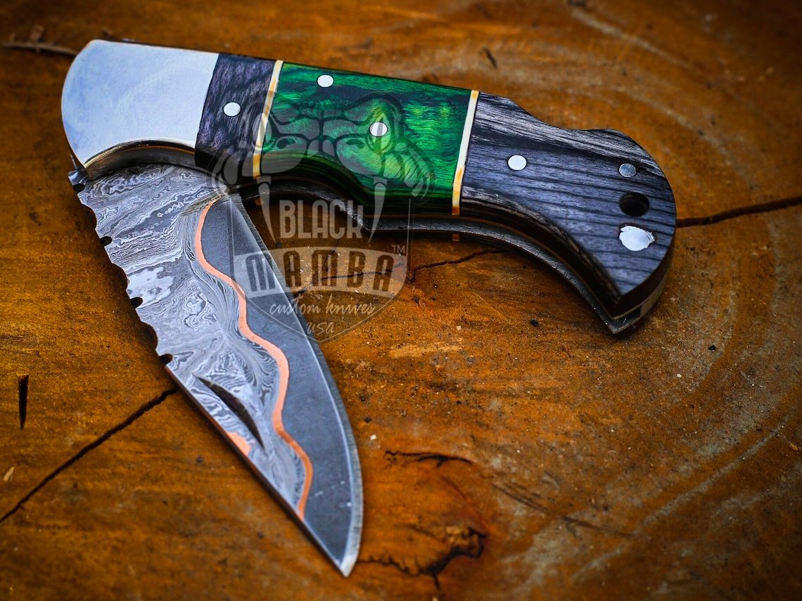 BMK-669 Emerald Trailblazer Hand forged Copper Damascus Folding knife | Handmade pocket knife| Gift for anniversary , Gift For Him.