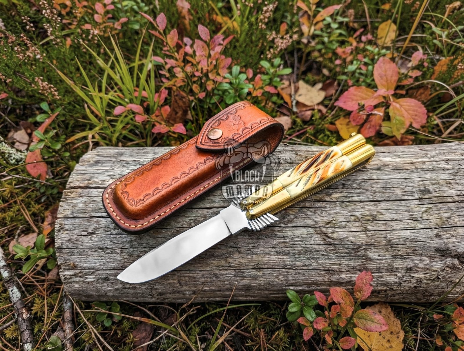 The handle is crafted from natural bone scales paired with solid brass bolsters, offering a striking contrast, excellent grip, and a luxurious feel in hand. Each knife is carefully handmade, making every piece unique. A custom leather sheath is included for safe storage and easy carry.