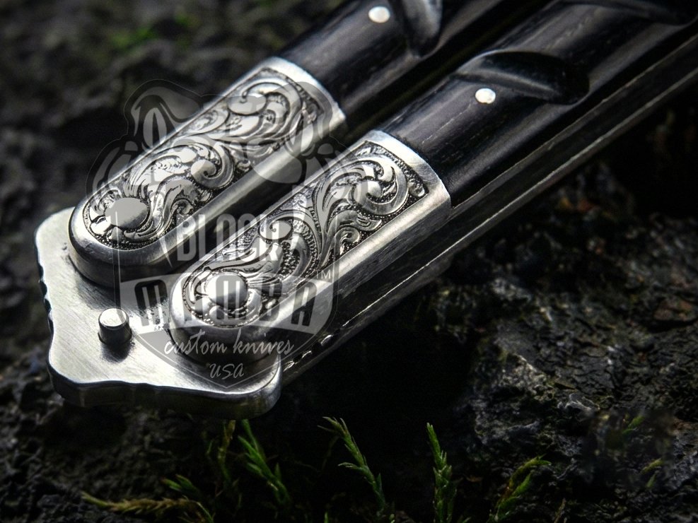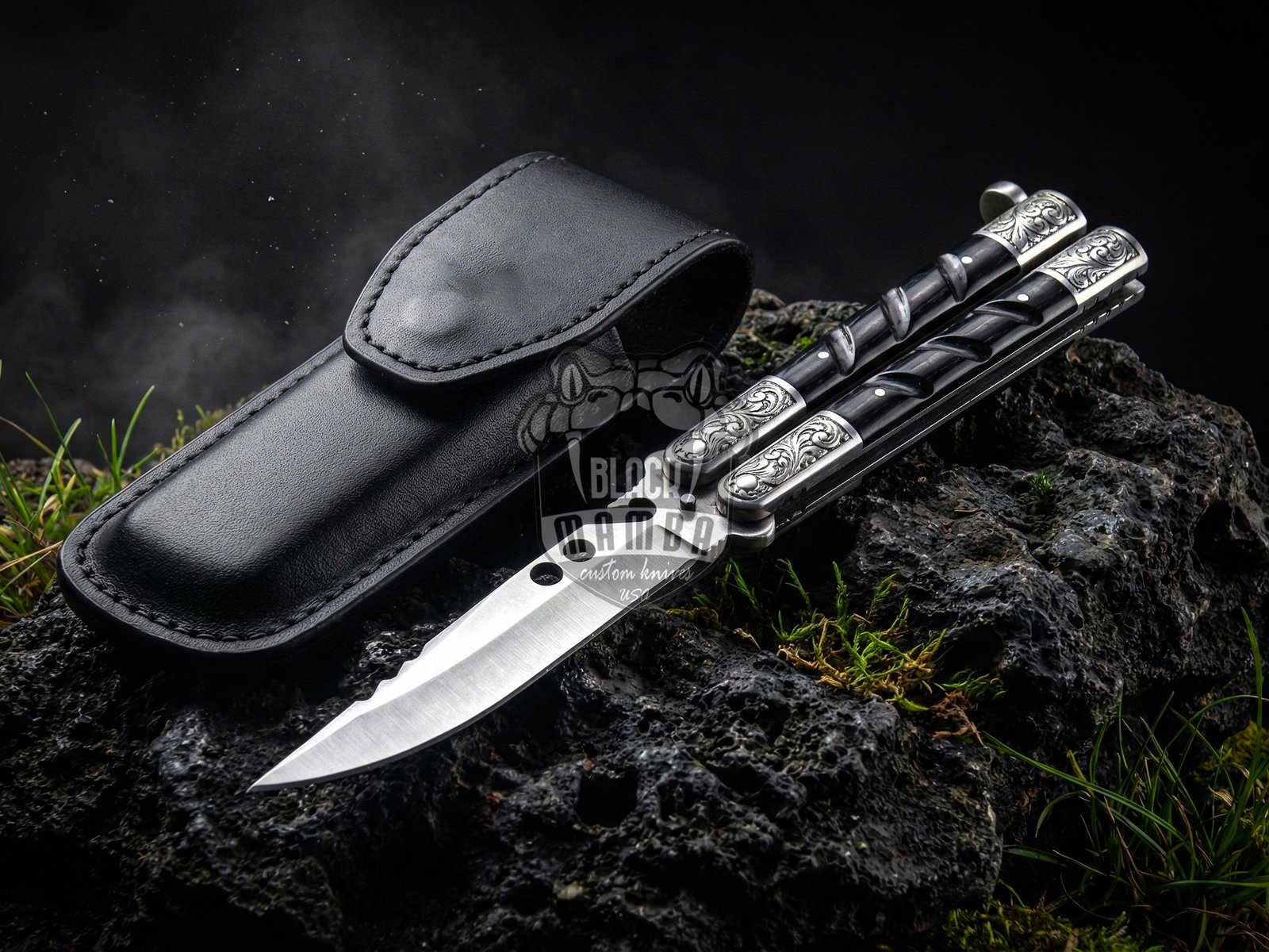 BMK-735 Handmade D2 Steel Balisong Knife | Black Horn & Steel Engraved Bolsters Handle | Premium Butterfly Knife with Leather Sheath