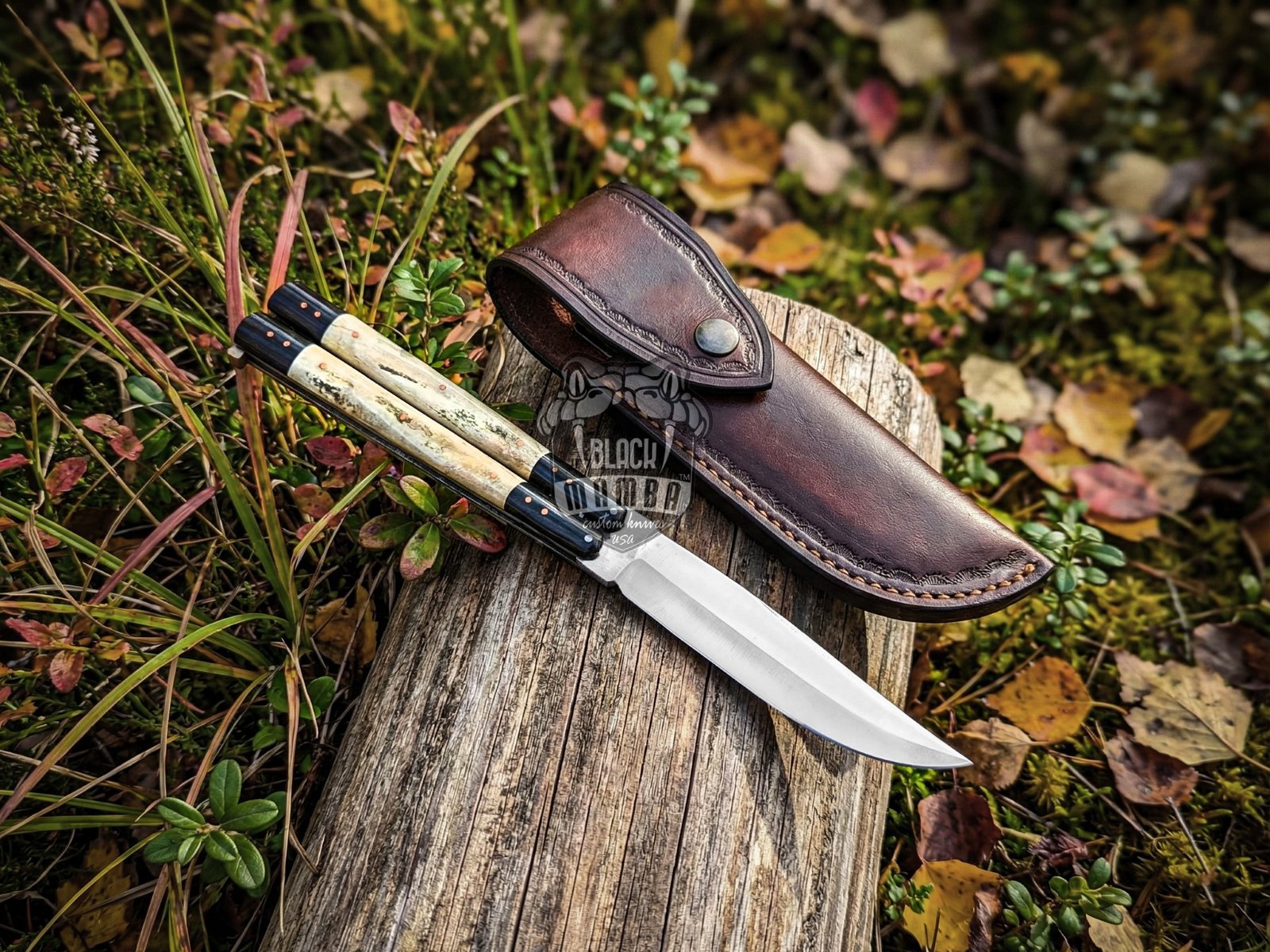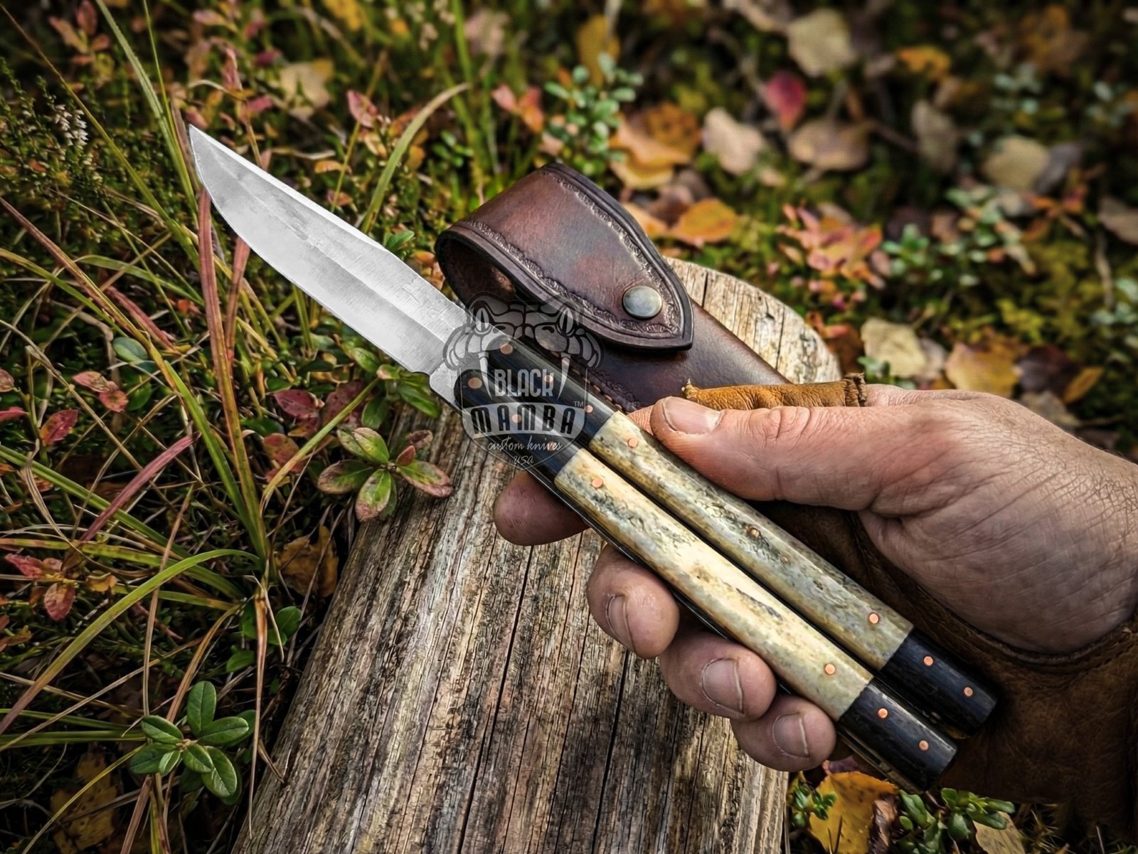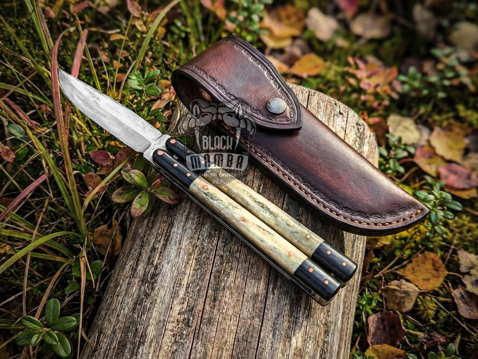 The handle showcases a striking combination of natural bone scales with black horn bolsters, creating a bold yet elegant look that stands out in any knife collection. Precision-balanced and smooth in action, this balisong knife delivers excellent control, strength, and flipping performance. A hand-stitched genuine leather sheath is included for safe storage and easy carry.