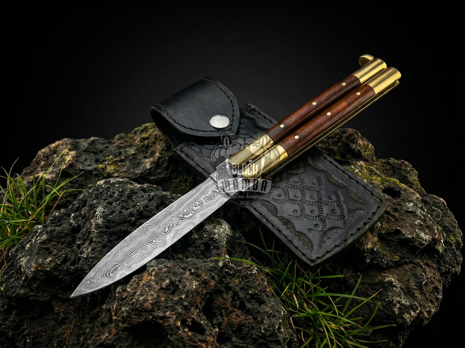 BMK-729 Handmade Damascus Steel Double Edge Balisong Knife | Rose Wood & Brass Bolster Handle | Premium Butterfly Knife with Leather Sheath Personalized Gift for Him & Her