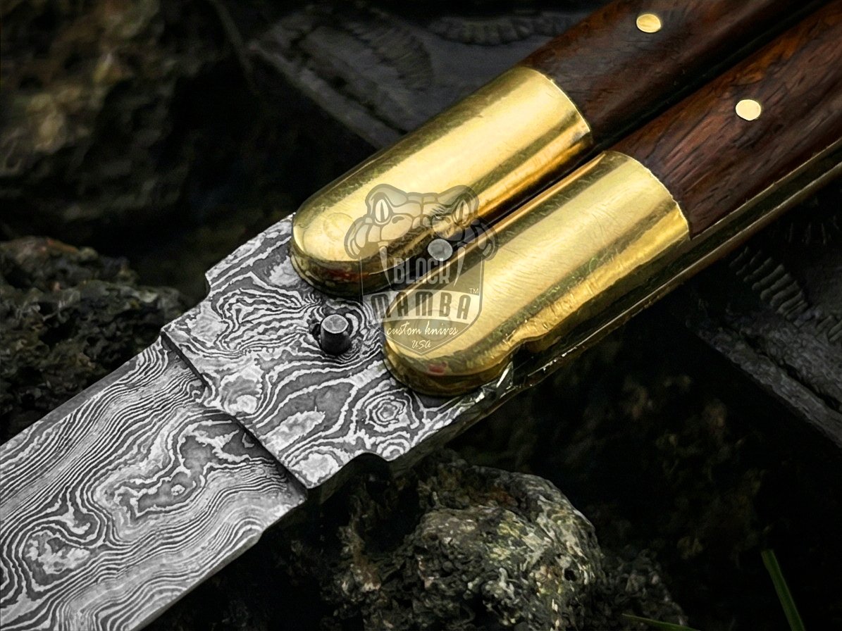 Experience the perfect blend of traditional craftsmanship and modern performance with our Handmade Damascus Steel Double Edge Balisong Knife. This premium butterfly knife is expertly forged for collectors, outdoor enthusiasts, and knife lovers who value both beauty and durability. Featuring a striking Damascus steel blade and a luxurious rose wood handle with solid brass bolsters, this balisong knife delivers exceptional balance, strength, and style.