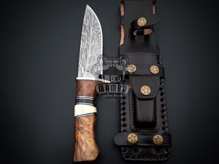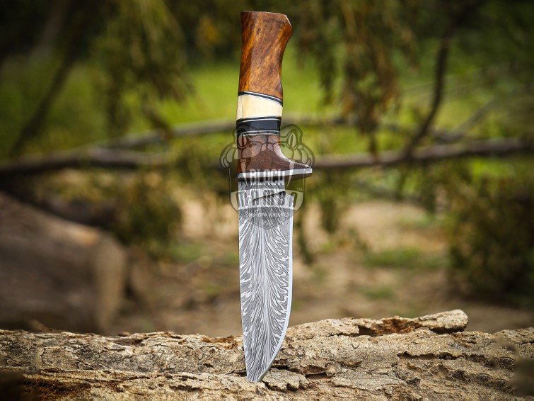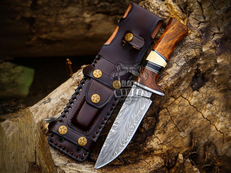 BMK-701 Feather Strike Handmade Damascus Feather Knife | Rose Wood & Bone Handle | Steel Bolster | Leather Sheath | Custom Hunting & Gift Knife