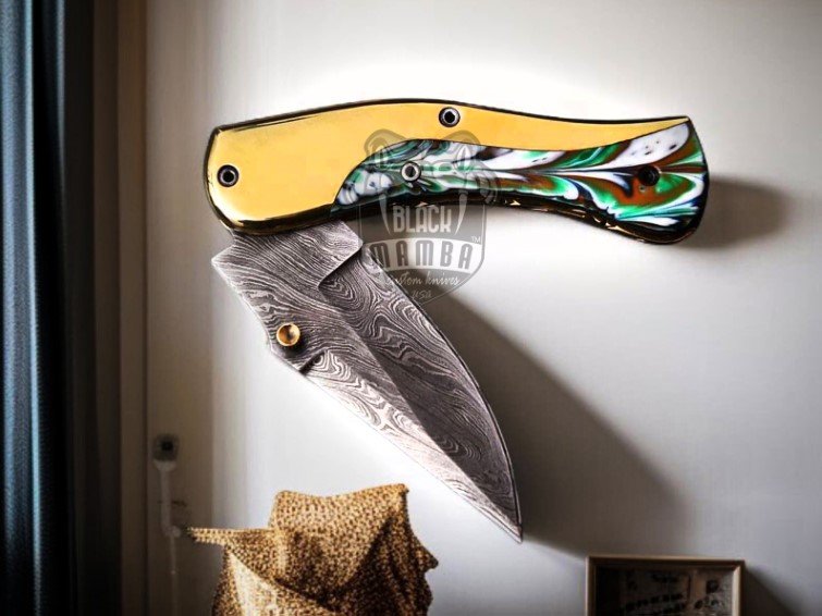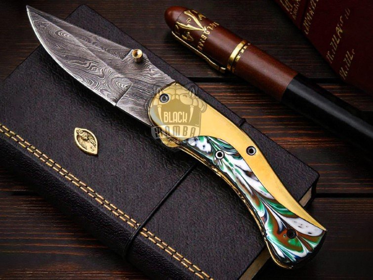 BMK-689 Black Mamba Emerald Enigma Handmade Damascus Steel Folding Knife | Abalone Resin Handle | Brass Bolster | Leather Sheath | Camping & Hunting EDC Gift for Him