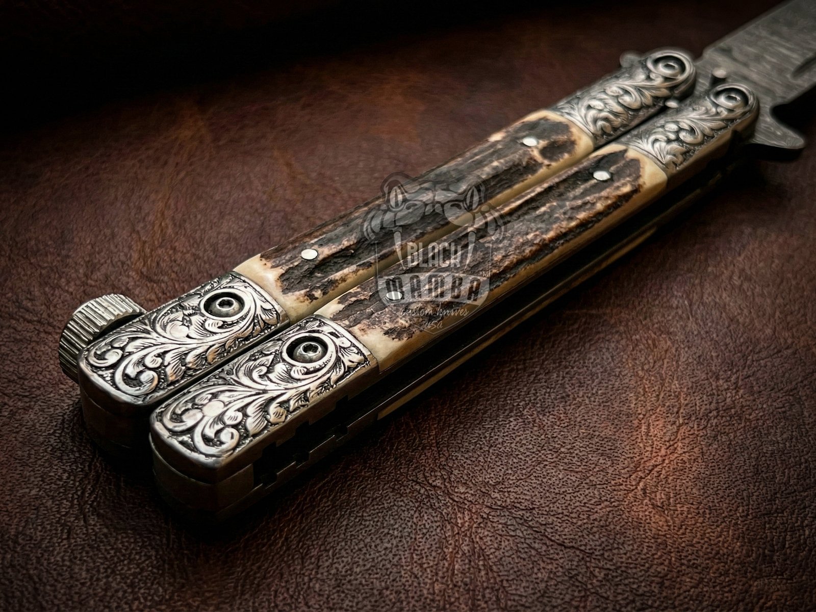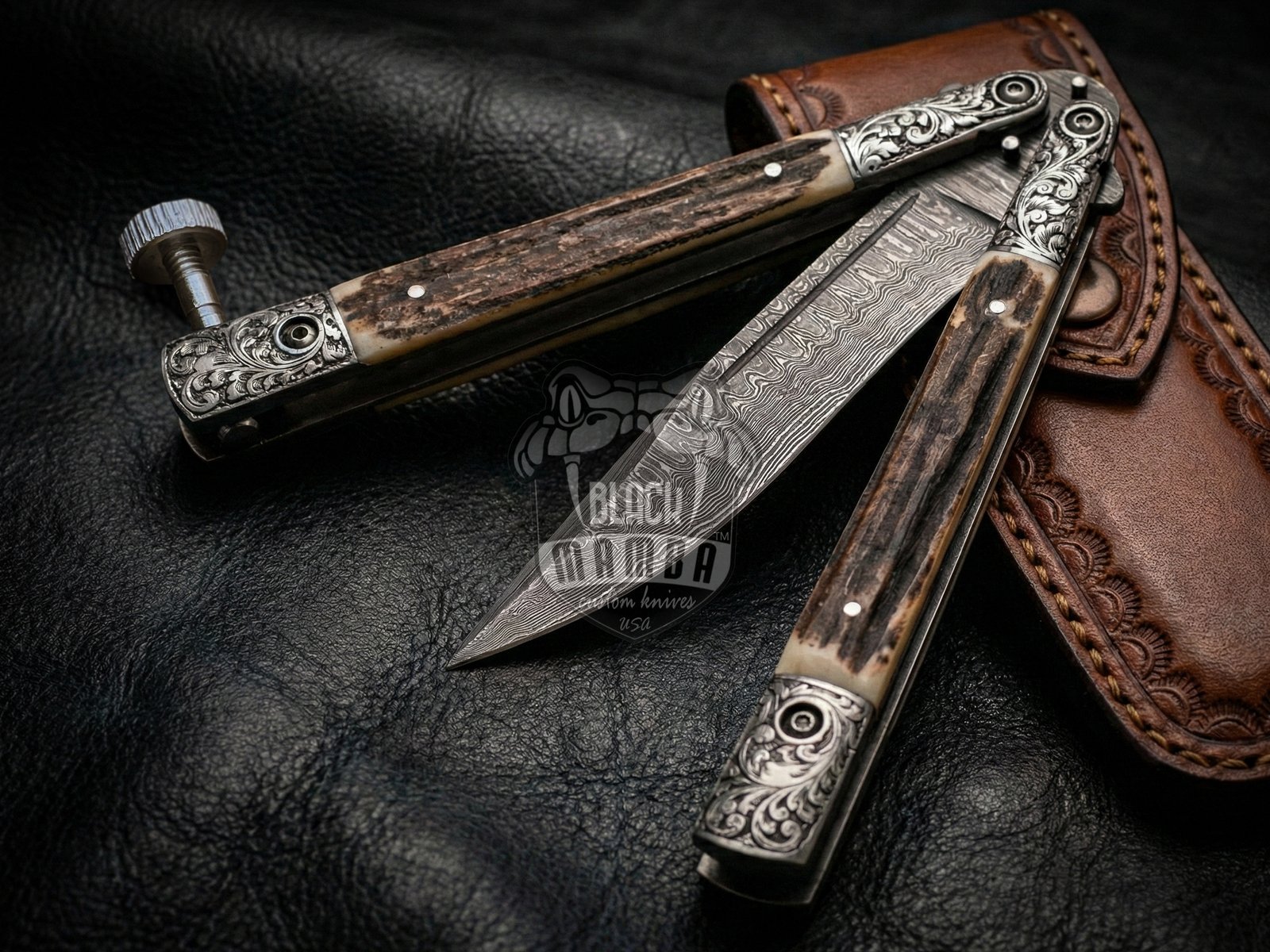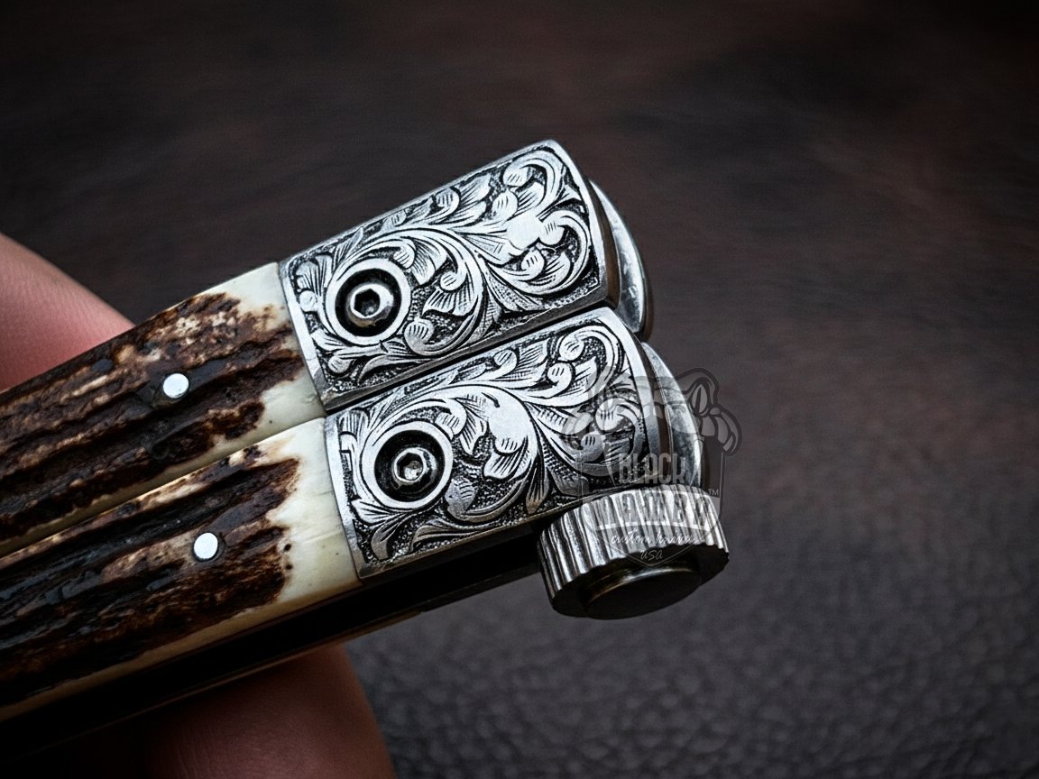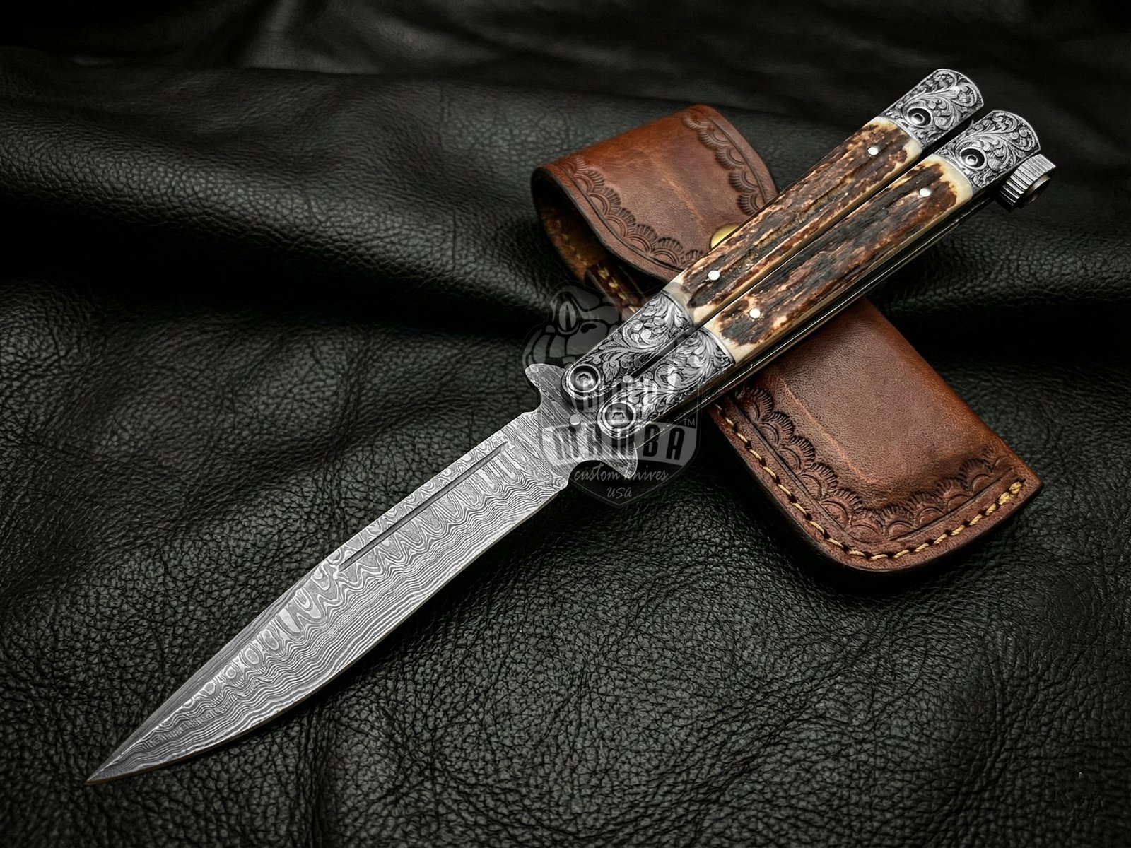 Experience unmatched craftsmanship with this Handmade Damascus Steel Balisong Knife, designed for collectors, outdoor enthusiasts, and premium knife lovers. Also known as a butterfly knife, this luxury balisong features a beautifully patterned Damascus steel blade paired with a natural stag handle and engraved steel bolsters, offering both durability and elegant aesthetics.