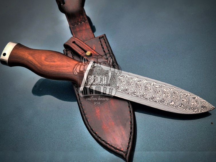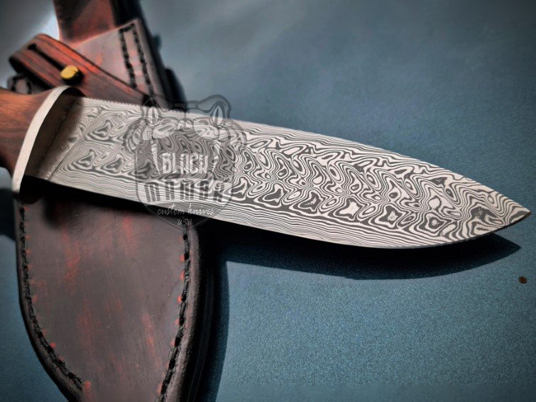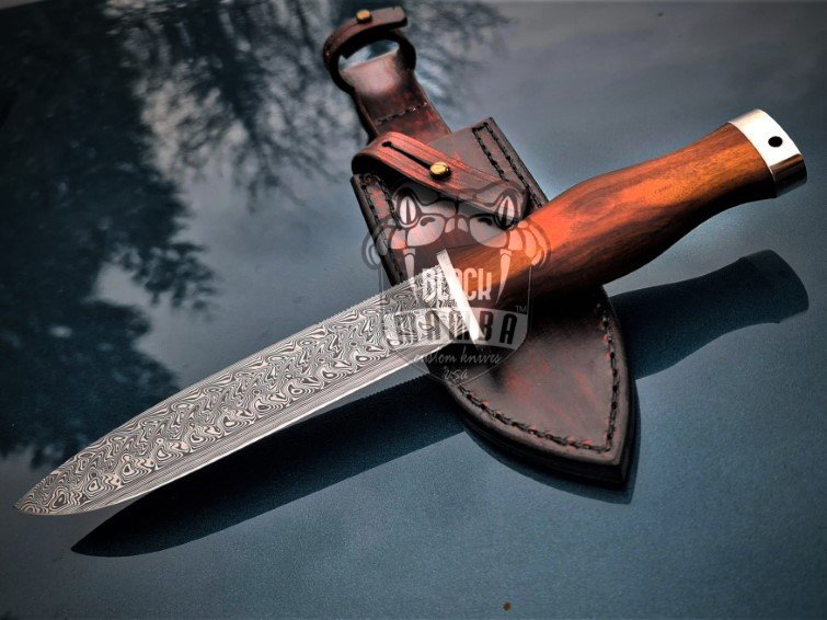 BMK-666 Black Mamba Wildwood Warden Handmade Damascus Steel with |Rose Wood Handle|Steel Bolster & Leather Sheath | Hunting , Camping Outdoor Knife