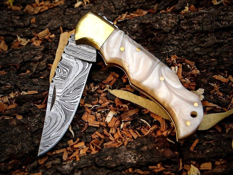 The handle is crafted from pearl-white resin, smoothly contoured for a comfortable and secure grip. A polished brass bolster adds balance, durability, and a touch of classic luxury to the overall design.