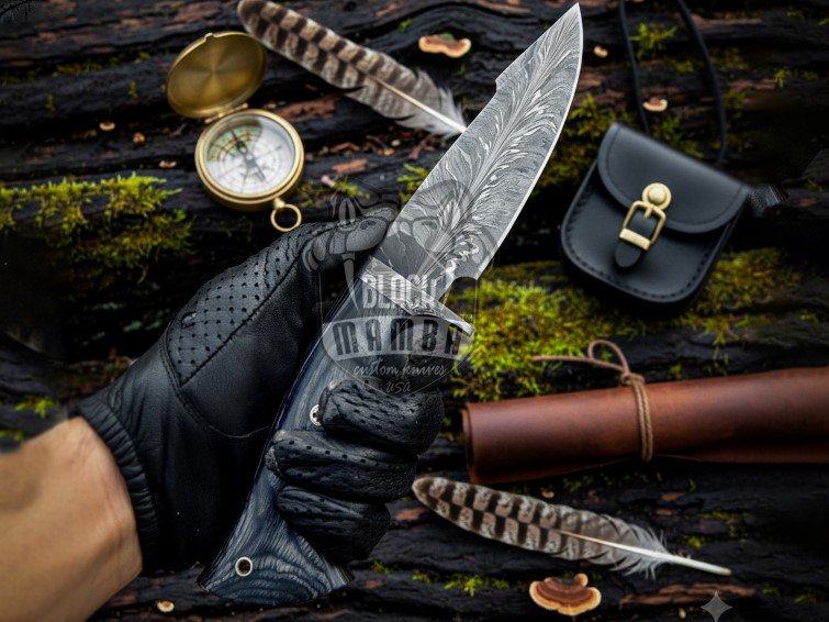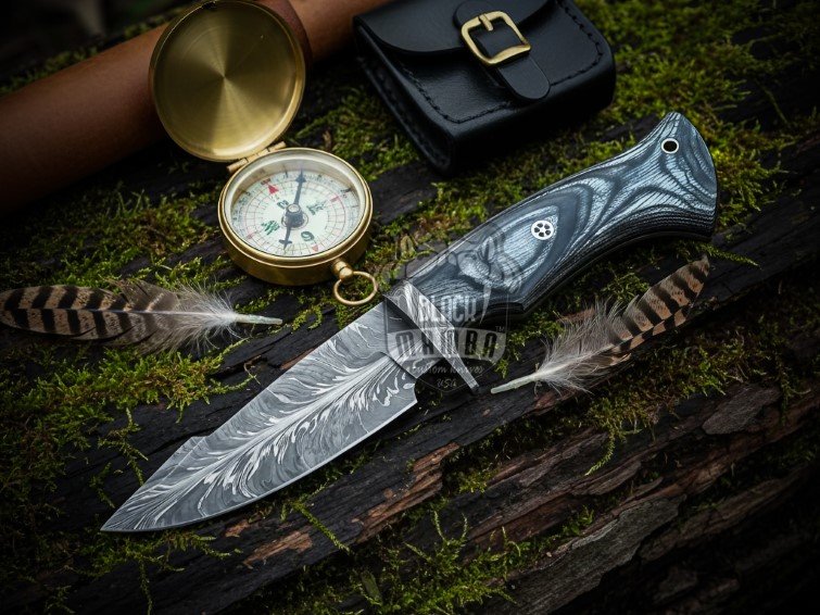 Handmade Damascus Steel Blade with feather pattern for sharpness and durability.