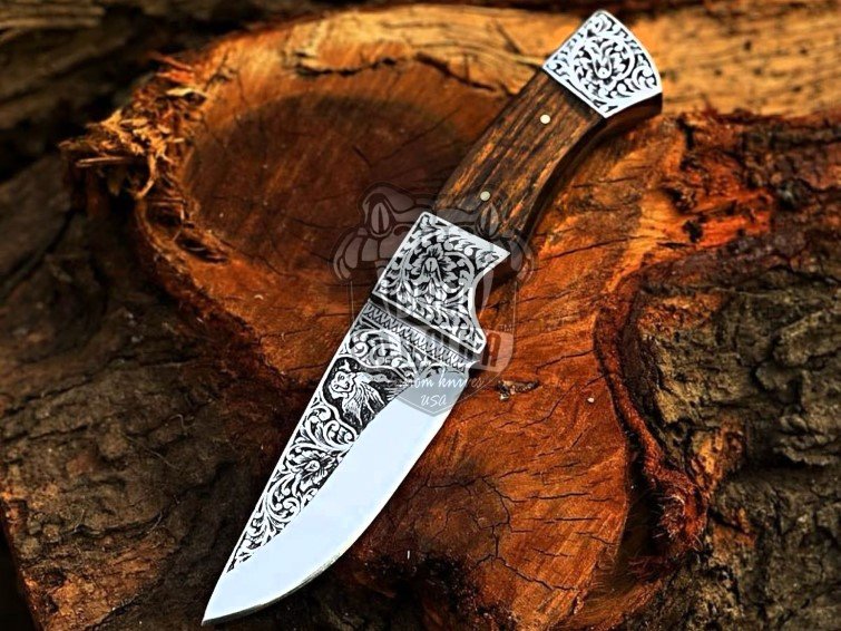 BMK-670 Royal Acanthus Hunter Handmade Stainless Steel Engarved Rose Wood Handle with | Engraved Steel Bolster | & Leather Sheath