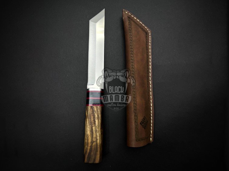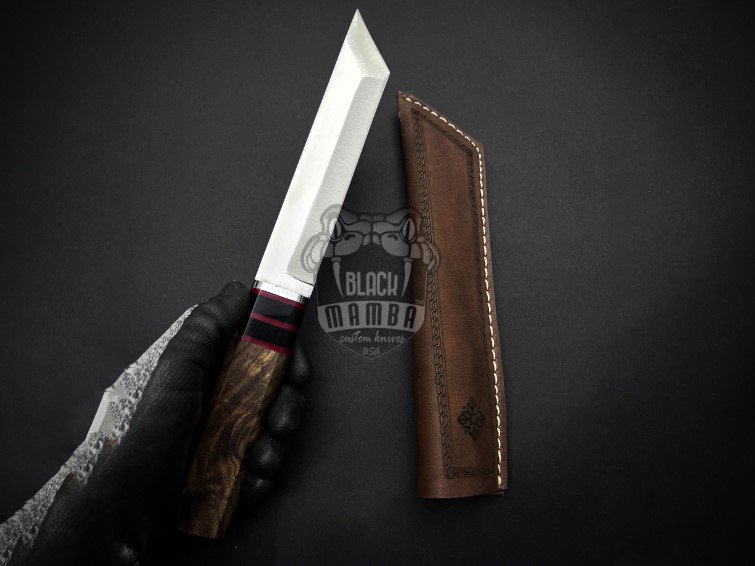 BMK-696 Black Mamba Shadow Storm Handmade Stainless Steel Tanto Knife with Walnut Wood Handle Fiber Spacer and Leather Sheath Camping Hunting Gift for Him & Her