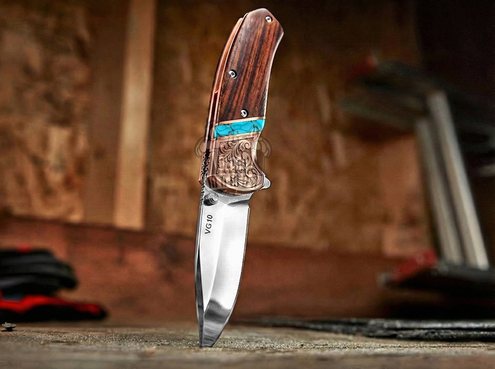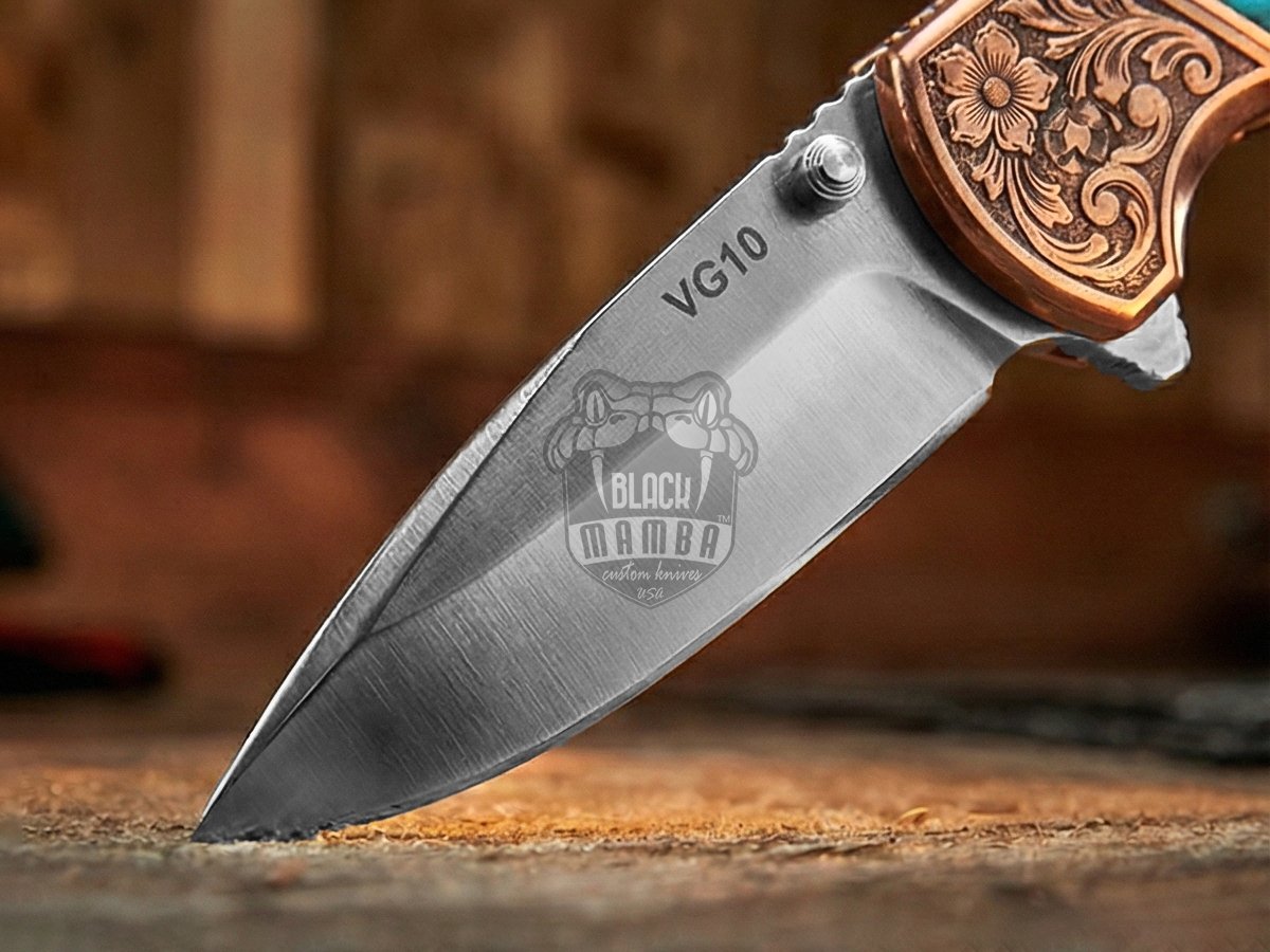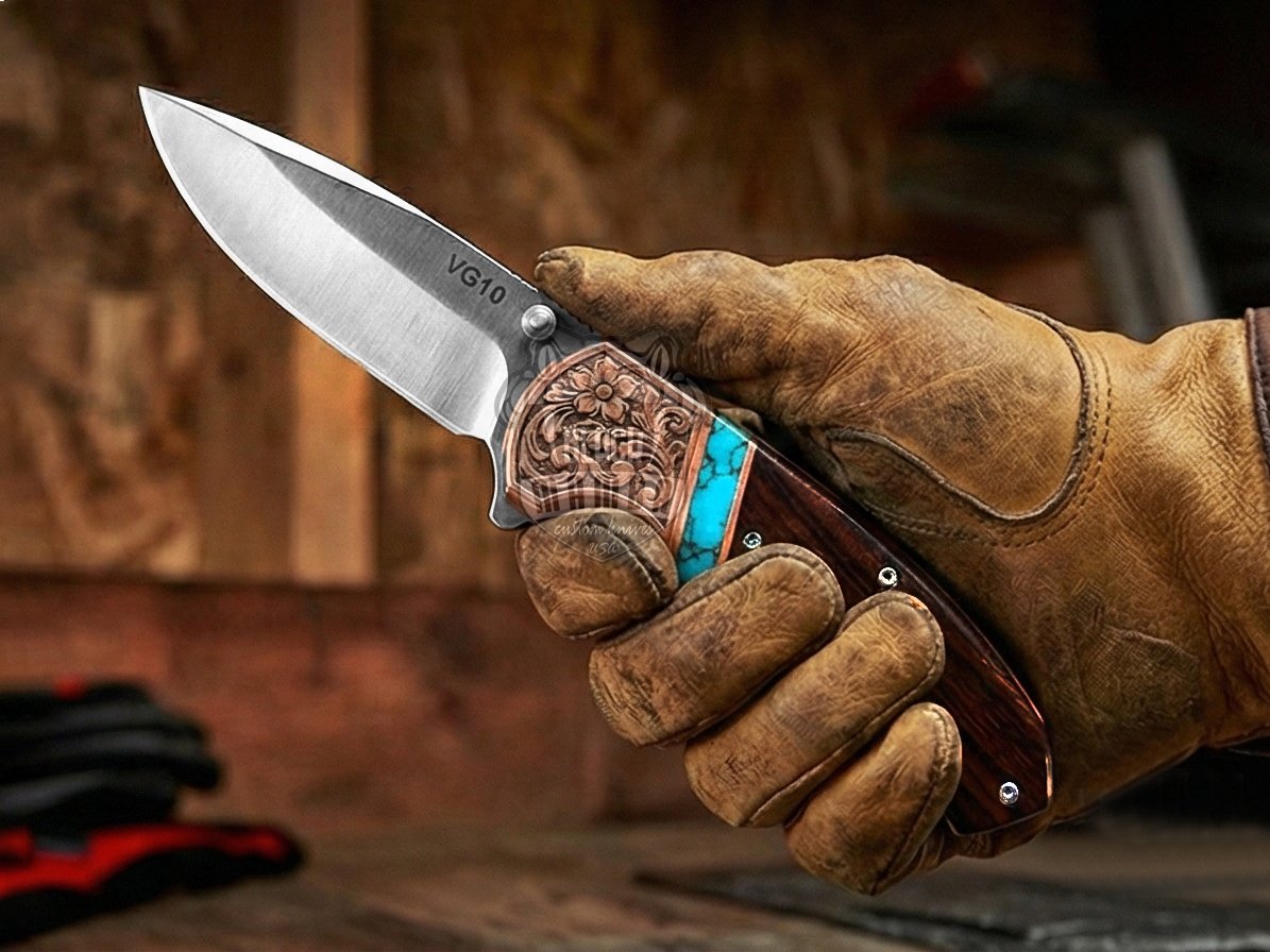 Experience the perfect fusion of craftsmanship, performance, and luxury with this Handmade VG10 Steel Folding Knife, designed for collectors, outdoor enthusiasts, and everyday carry lovers. Featuring a stunning Rose Wood handle accented with Turquoise stone and a Copper Engraved Bolster, this premium pocket knife delivers both beauty and durability in one powerful design.