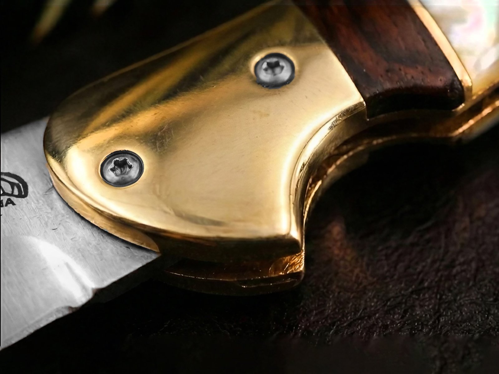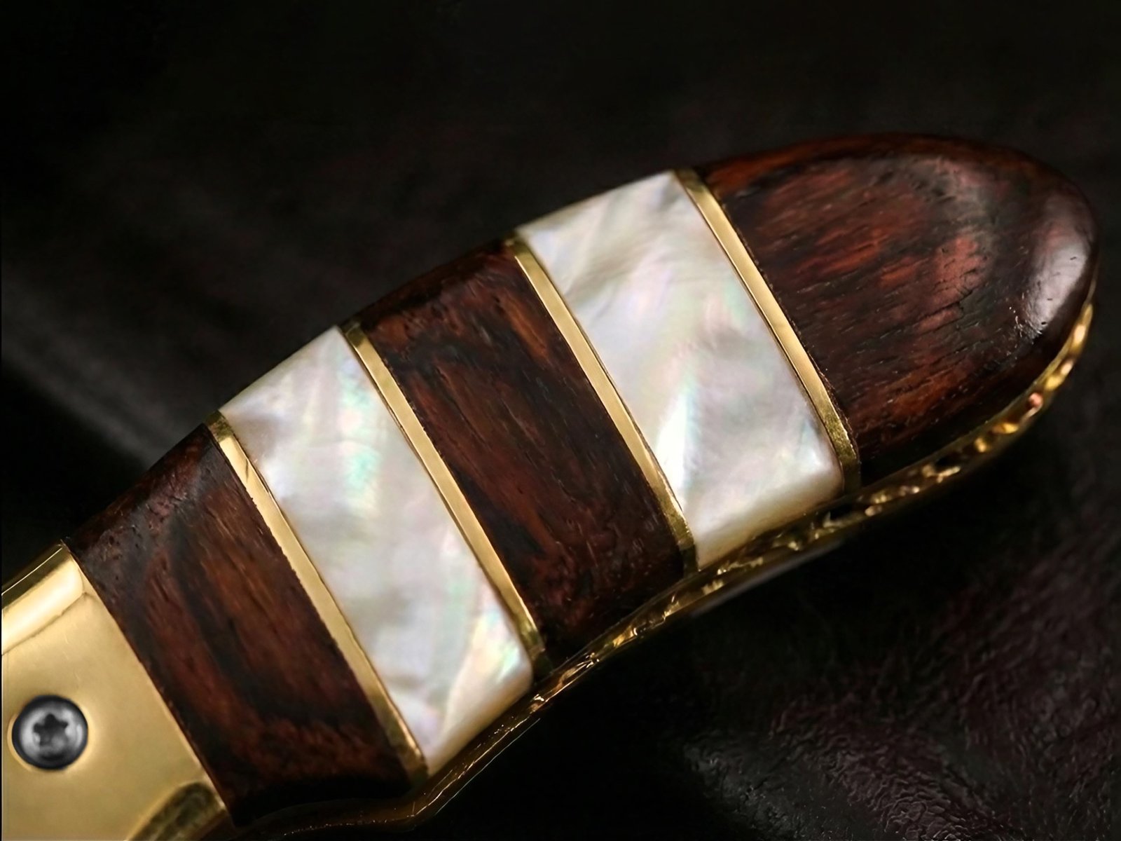 The razor-sharp VG10 stainless steel blade is known for its excellent edge retention, corrosion resistance, and durability. The beautifully contoured rosewood handle, enhanced with pearl shell inlay and solid brass bolsters, provides a comfortable grip while adding a refined, handcrafted look. A premium leather sheath is included for safe carry and storage.