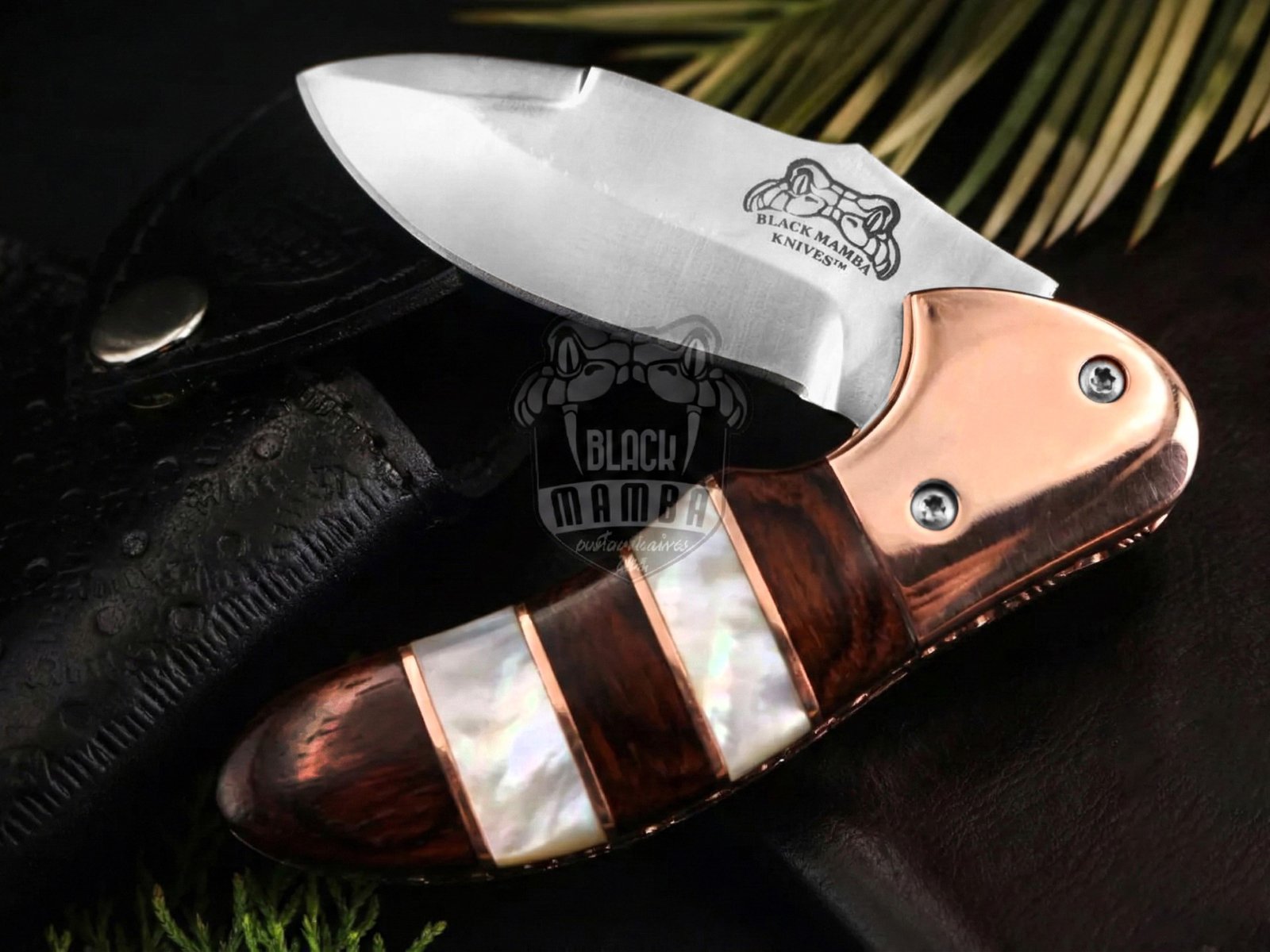 The handle is a true work of art, featuring natural rosewood, genuine pearl shell inlay, and solid copper bolsters, creating a perfect balance of beauty, strength, and comfort. Each knife is carefully handcrafted, making every piece unique. Supplied with a premium leather sheath, this knife is ideal for safe storage and convenient carry.